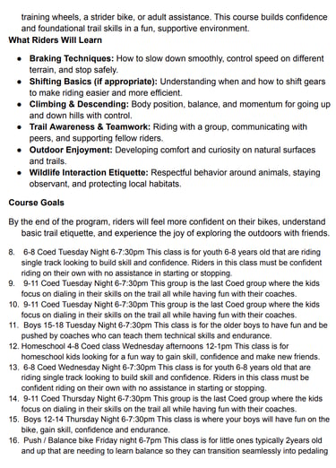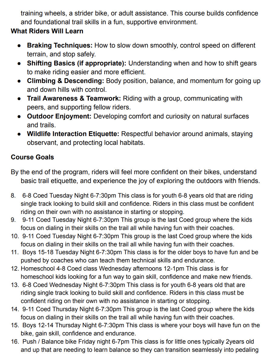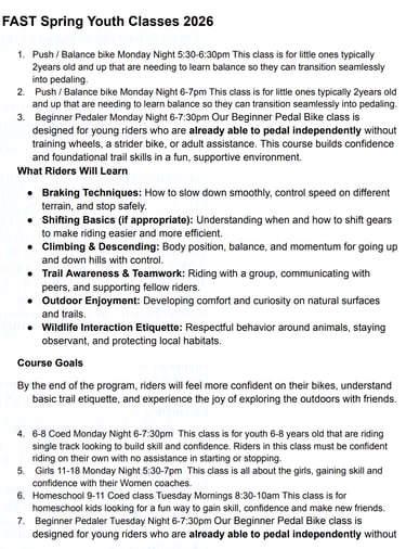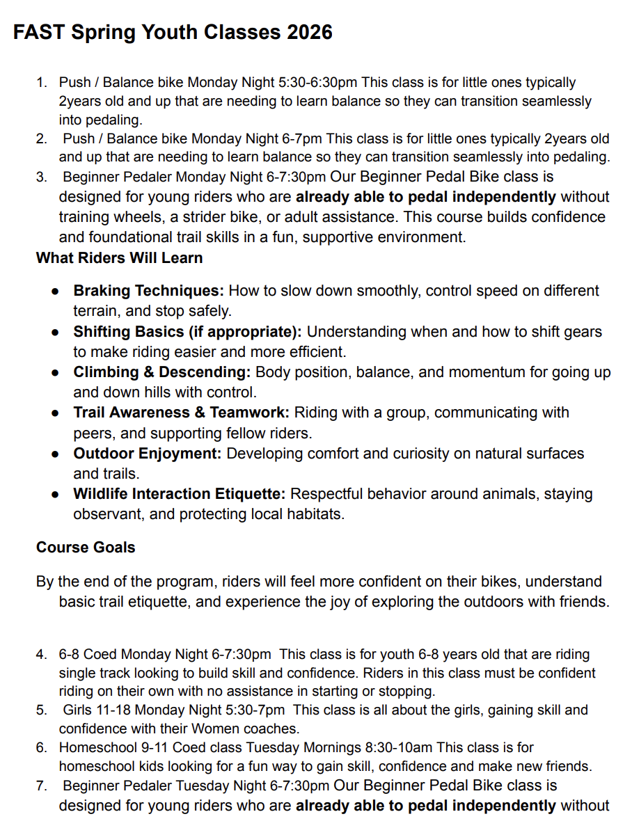 FAST offers 8 week youth mountain bike classes in the Spring and Fall for ages 2 - 18.